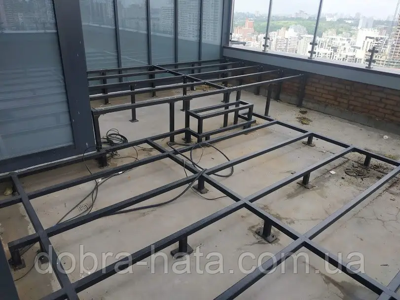 Під час монтажу тераси на металокаркас, зазвичай використовуються профільні труби, перетин яких залежить від технічного завдання. Якщо металокаркас монтується на відкритій землі, то його опори (ніжки) необхідно бетонувати. У разі, якщо монтаж проводиться на покрівлі, під ніжки встановлюють «опорні п'яти», щоб уникнути порушення гідроізоляційного шару. Для тривалішого терміну експлуатації, за будь-якого типу монтажу, металокаркас підлягає попередньому обробленню фарбою для металу.