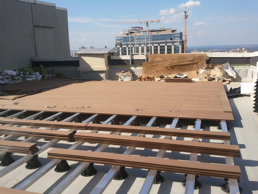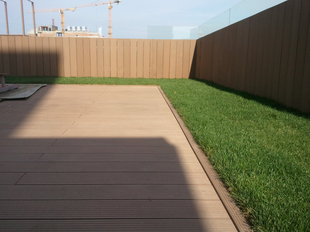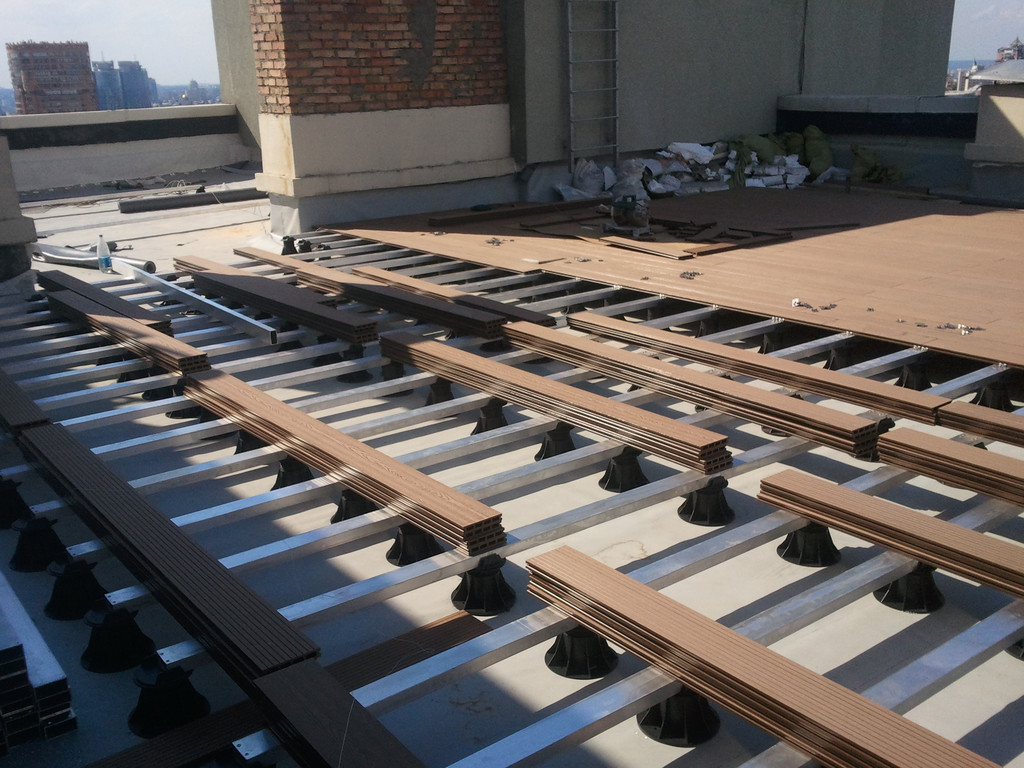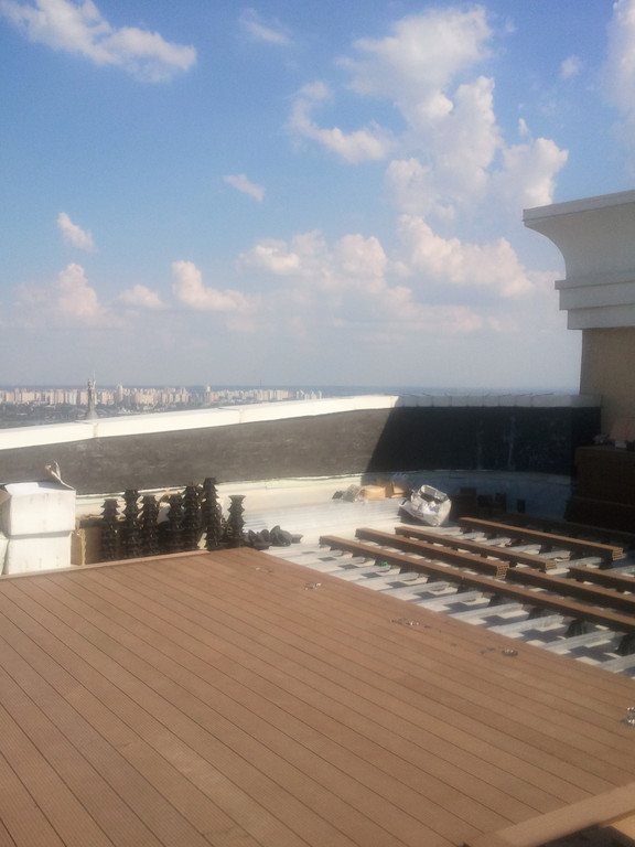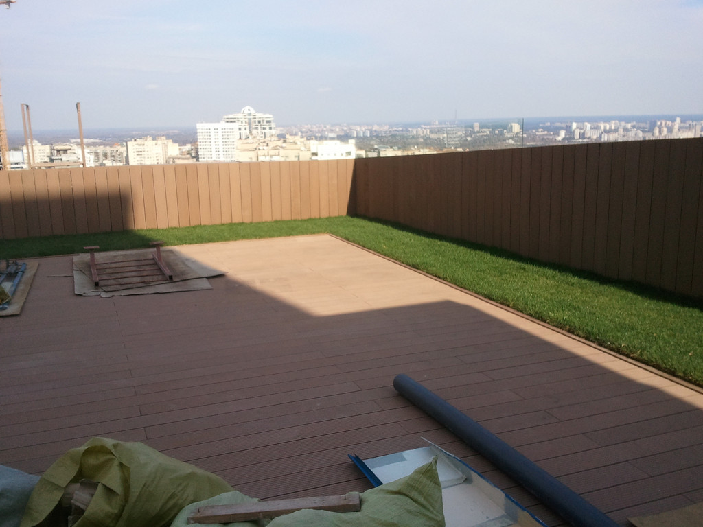 Для забора и террасы, была использована террасная доска SunDeck (Турция). Монтаж производился на алюминиевые лаги с регулируемыми опорами