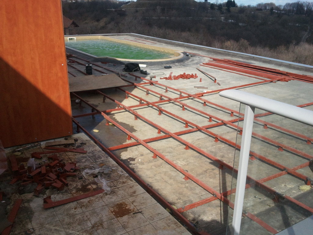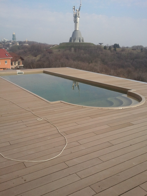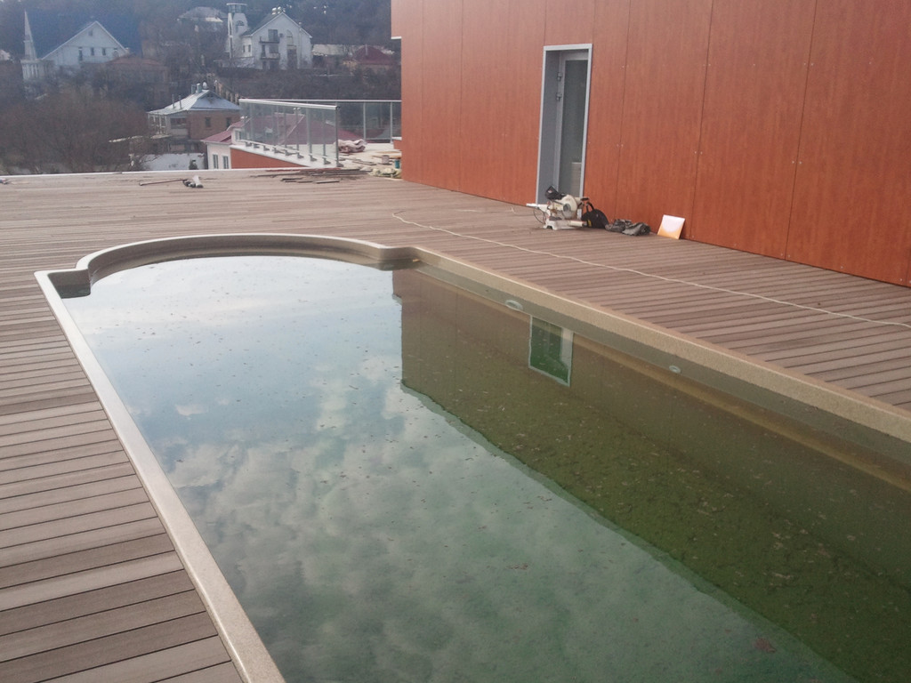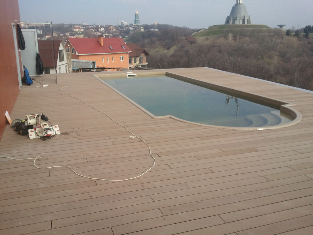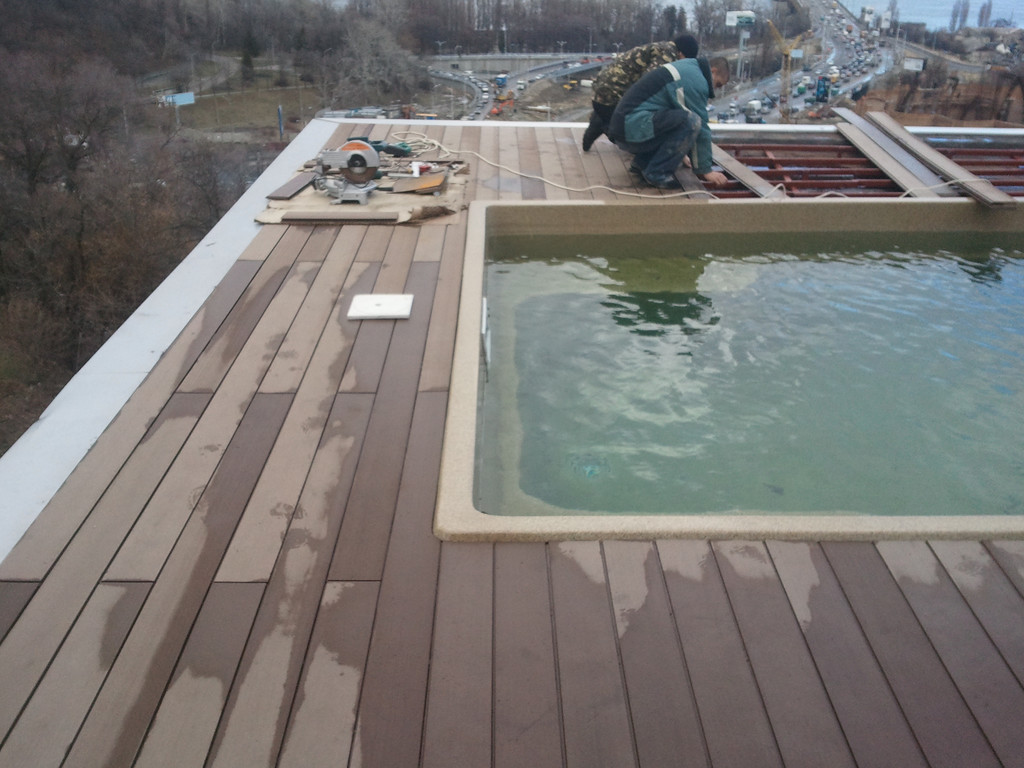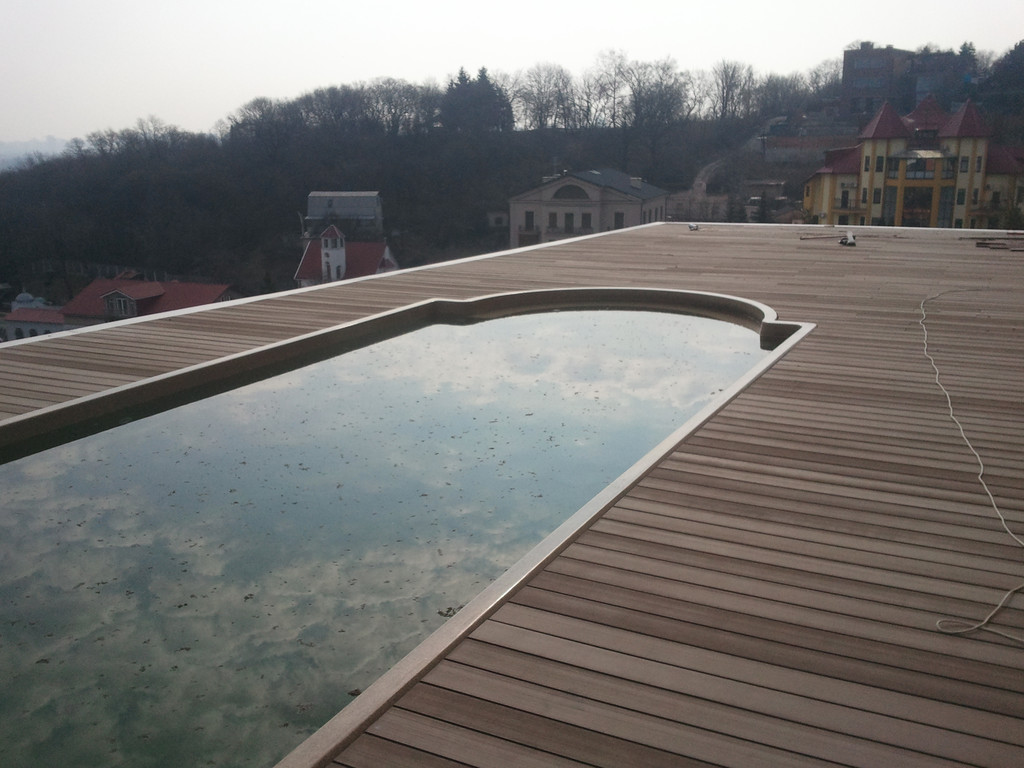 Терраса вокруг бассейна на крыше, монтаж на метало-каркас. Террасная доска Werzalit (Германия).