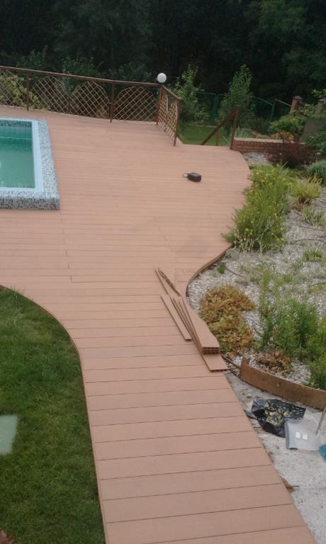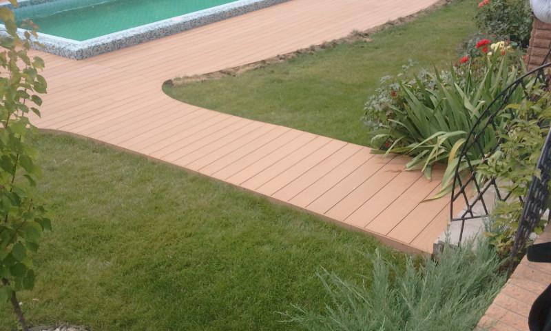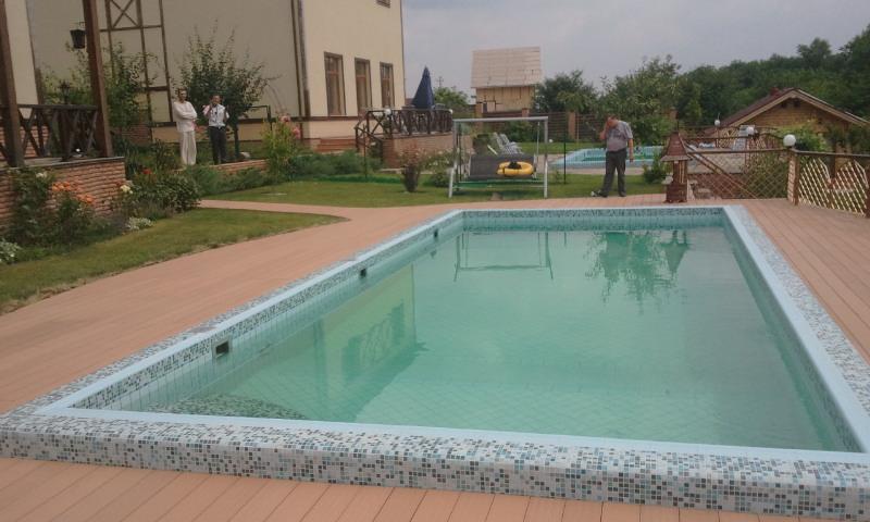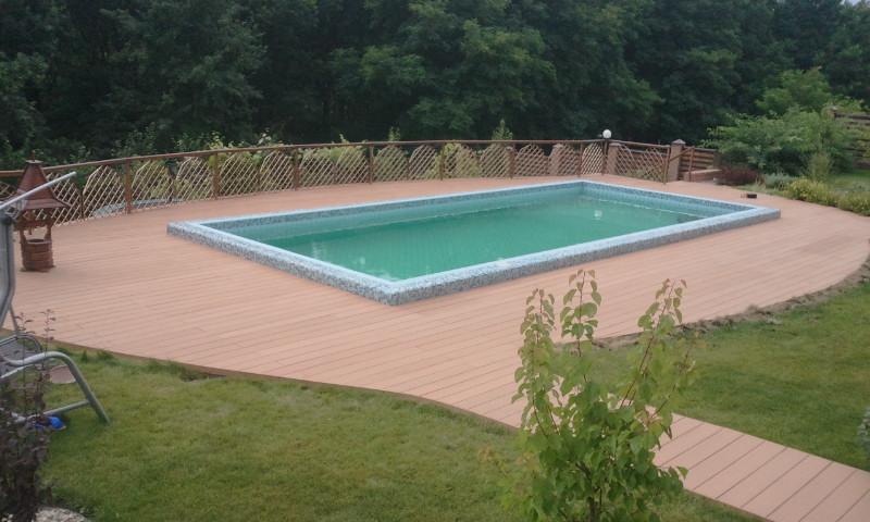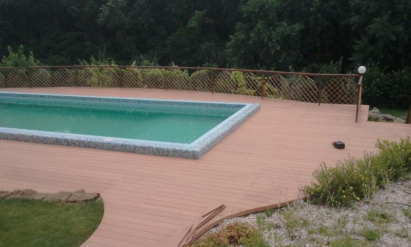 Использование террасной доски Terranson (Китай), оформление бассейна. Монтаж террасы производился на бетонной стяжке, с использованием лаг. Монтаж на бетонной стяжке возможен при условии идеально ровной поверхности.