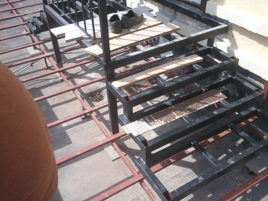 • Під час монтажу тераси на металокаркас, зазвичай використовуються профільні труби, перетин яких залежить від технічного завдання. Якщо металокаркас монтується на відкритій землі, то його опори (ніжки) необхідно бетонувати. У разі, якщо монтаж проводиться на покрівлі, під ніжки встановлюють «опорні п’яти», щоб уникнути порушення гідроізоляційного шару. Для тривалішого терміну експлуатації, за будь-якого типу монтажу, металокаркас підлягає попередньому обробленню фарбою для металу.